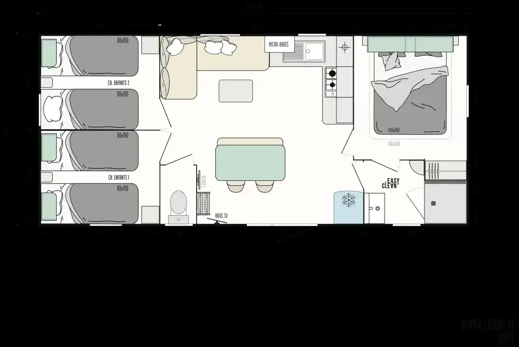 - 1 chambre lits superposés et 1 lit simple de 80cm.