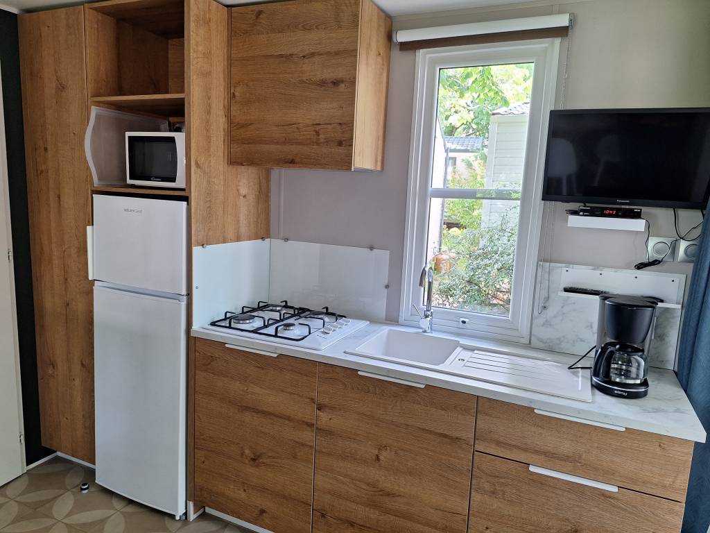 - Cuisine avec frigo/congélateur, micro-onde, cafetière électrique, 4 feux gaz.